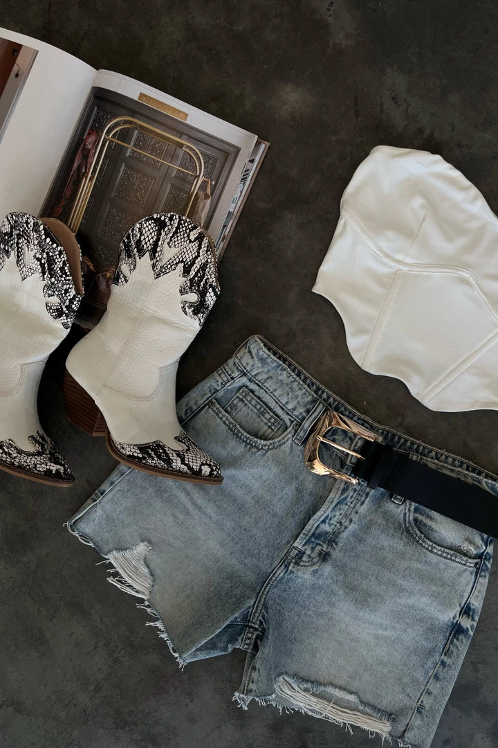 Needing a little edge to your western glam look? The Stellar White Snakeskin Cowboy Boots will complete your fit and have heads turning. These boots are the perfect statement shoe that spices up any outfit and will have you strutting with confidence. Â