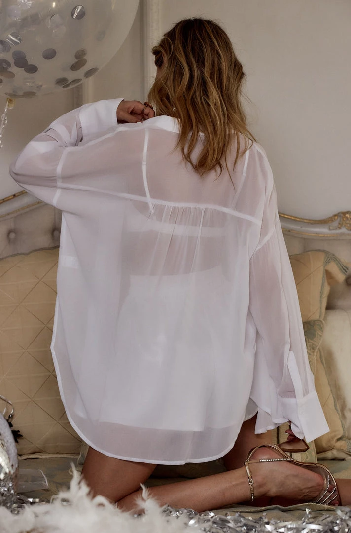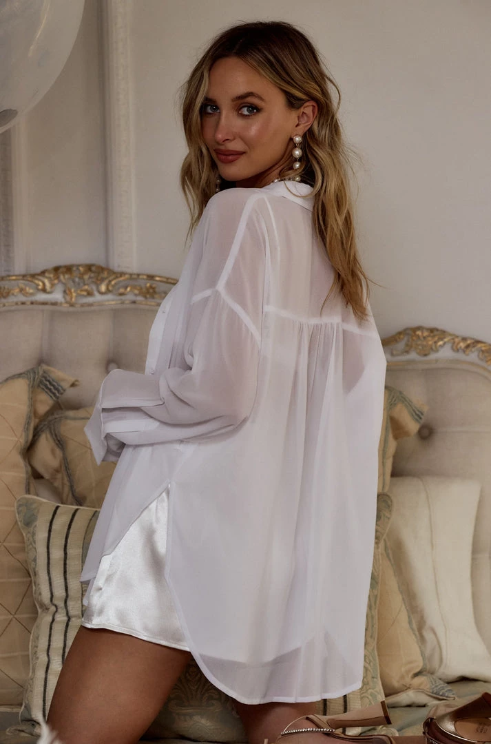 Snag the sheer Brigitte White Chiffon Top to perfectly pair with the Serenity Satin Set or any swimsuit to be fully resort ready. This piece can easily transition from casual beach or pool side attire to an elevated night out fit with the gals!