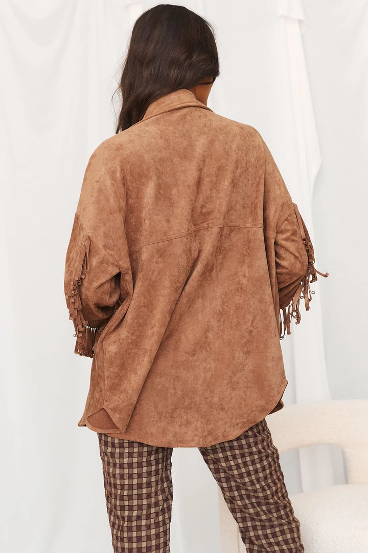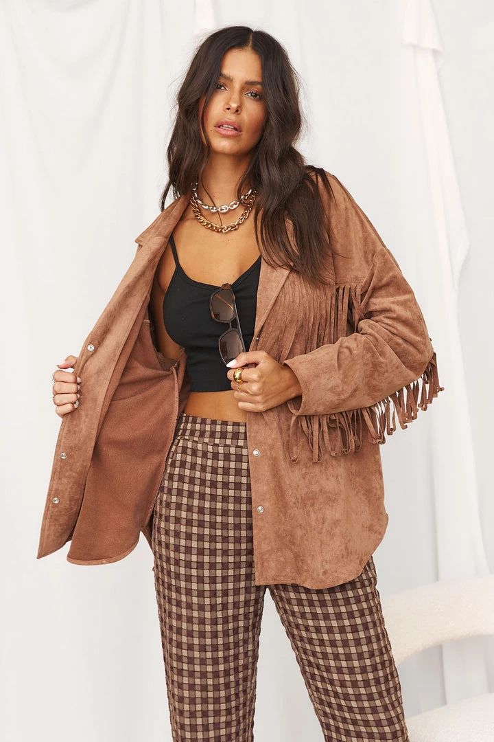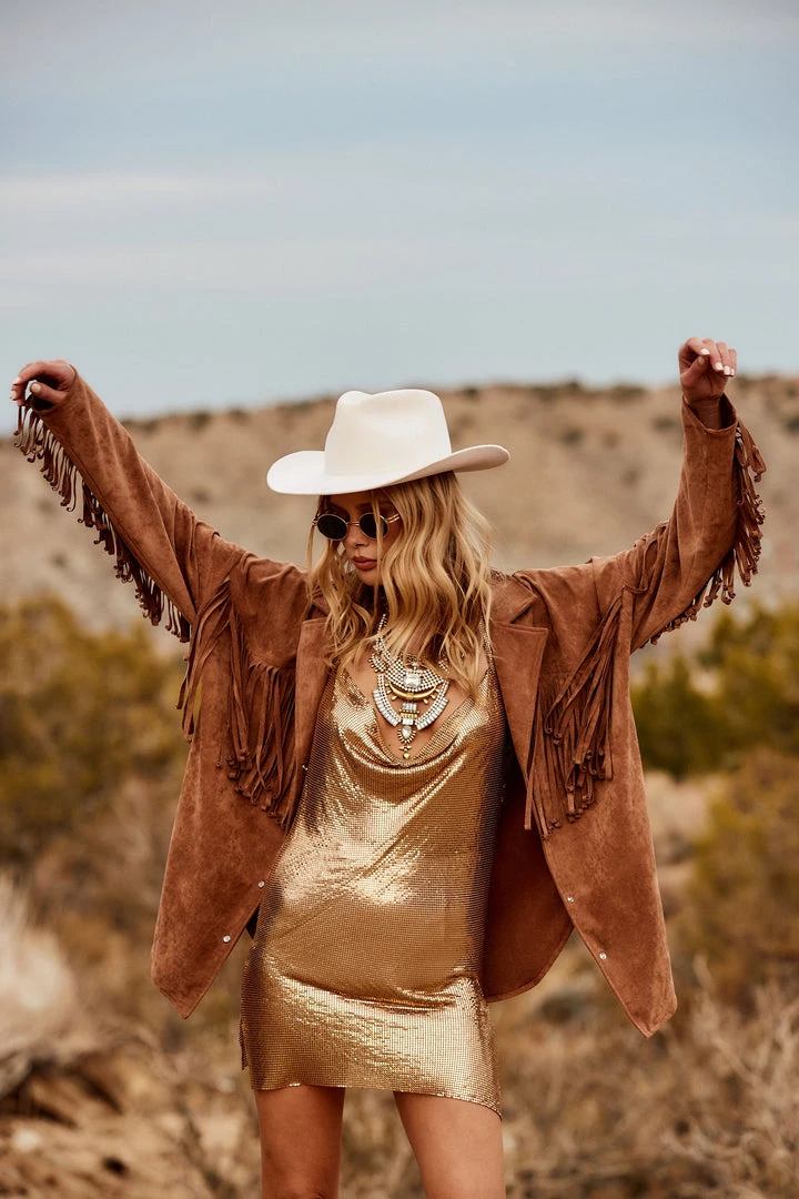 Festival season just got better. Our Favorite suede jacket provides that vintage fringe detail you need to complete your western inspired festival look. The Desert Palm Fringe Suede Jacket is just warm enough to give you an extra, stylish, layer for those evening or Fall performances.
