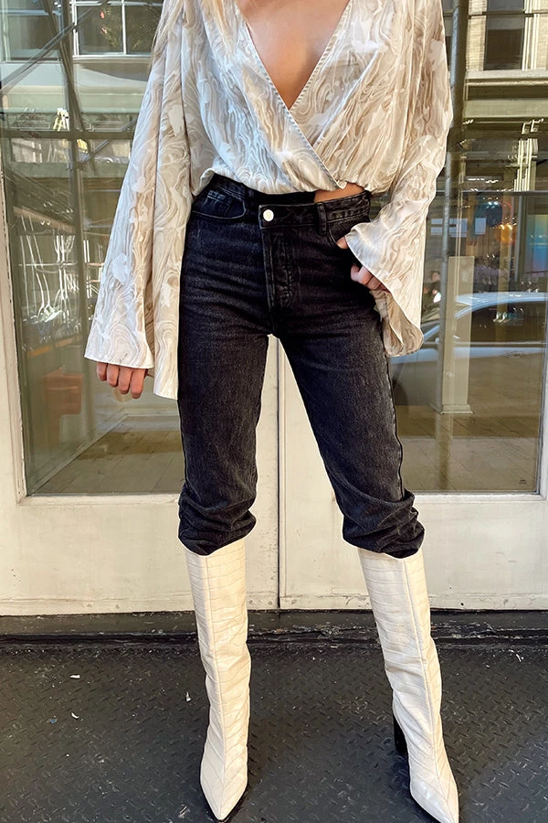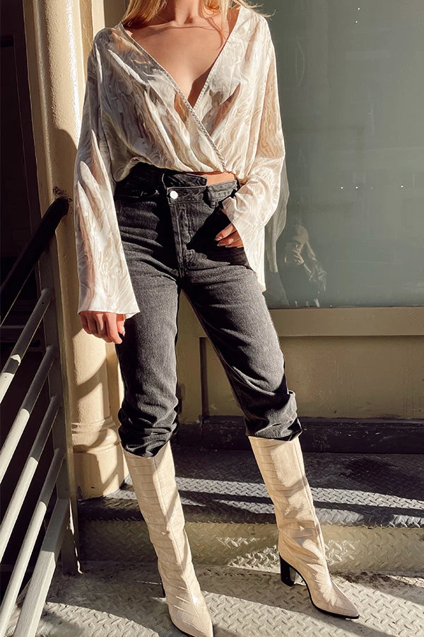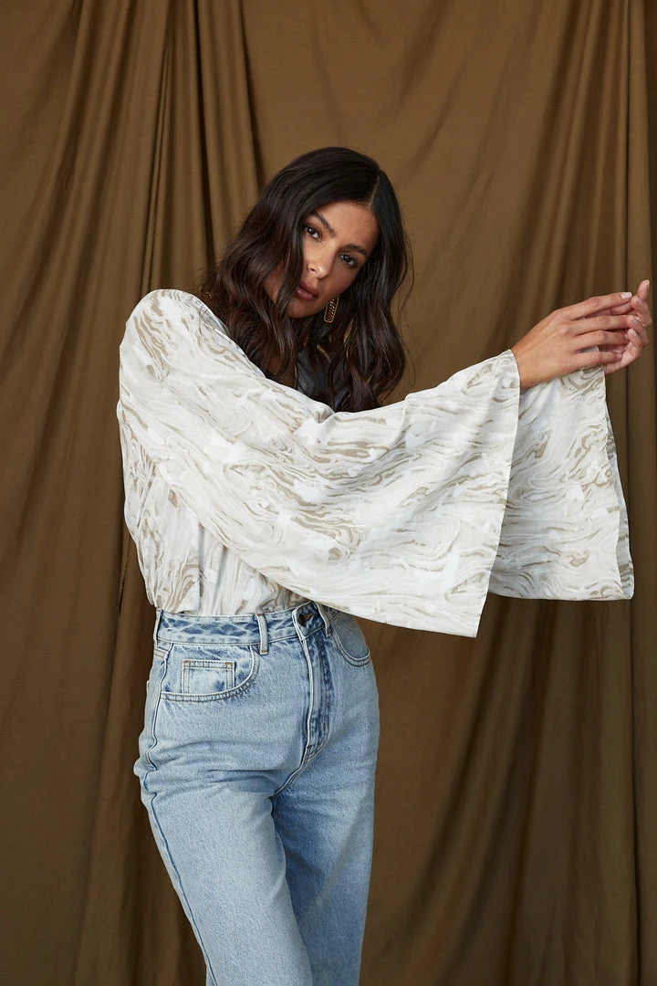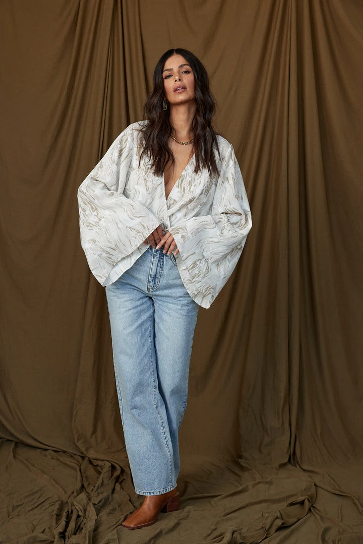 – beige and white swirl surplice blouse