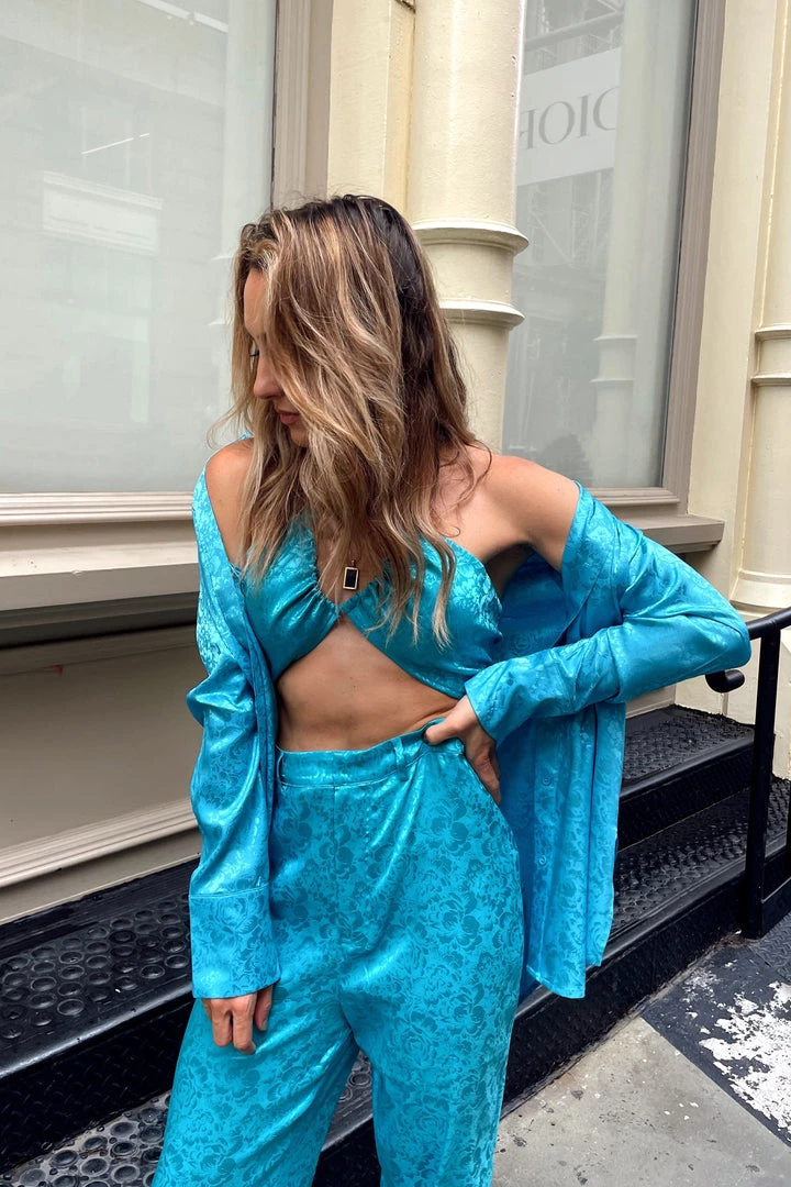 Because you have loved our St. Barths Emerald Set for two years, we have designed in to our beautiful summer Aqua! You’re packing your suitcase and heading to your island escape, the St. Barths Aqua Jacquard set is coming with! These silky pants are breezy, comfortable, and elevated… Couldn’t ask for more! Snag the matching St. Barths Aqua Jacquard Crop Top and the Gold Rush Aqua Jacquard Blouse and your look is complete!