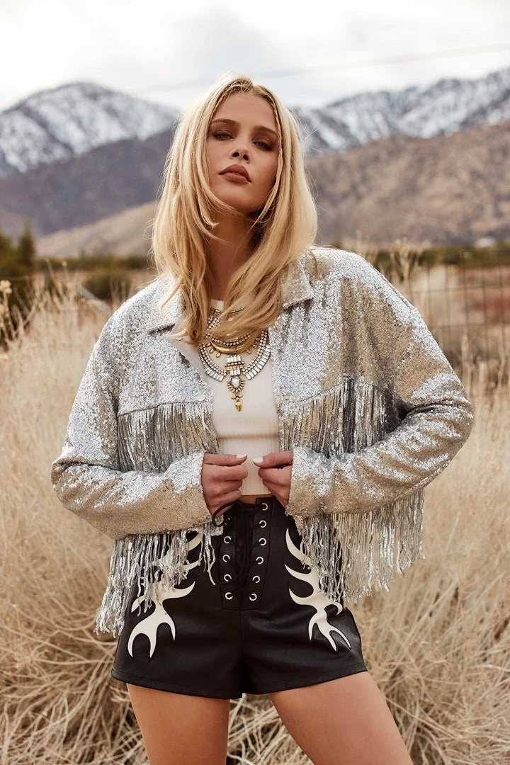 This cropped fringe jacket with silver sequins is for the country diva in all of us. If you’re looking to stand out and ensure nobody else has your vibe, then the Star Crossed is for you.