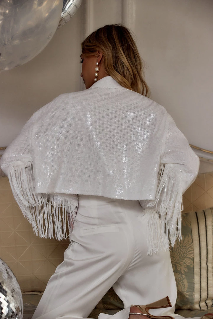 If you loved our Star Crossed Silver Sequin Jacket for festival, you’ll want to MARRY this white option! Made with a sequin fabrication and fringe detailing, this baby glistens and shines to match the occasion. Throw on this number and you are the star of the show!