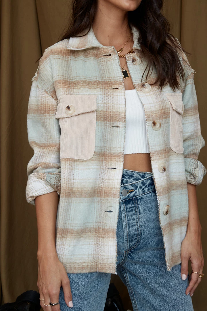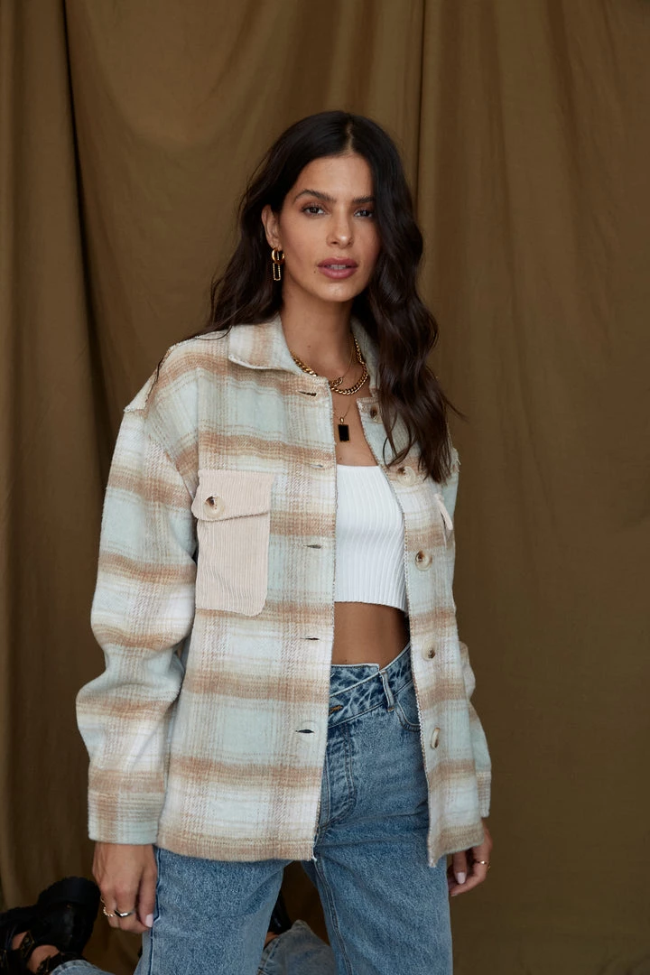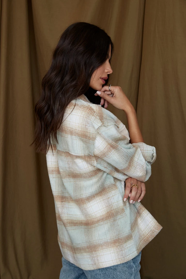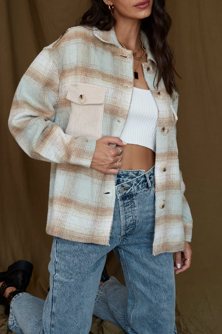 –Â tan and blue plaid flannel jacket