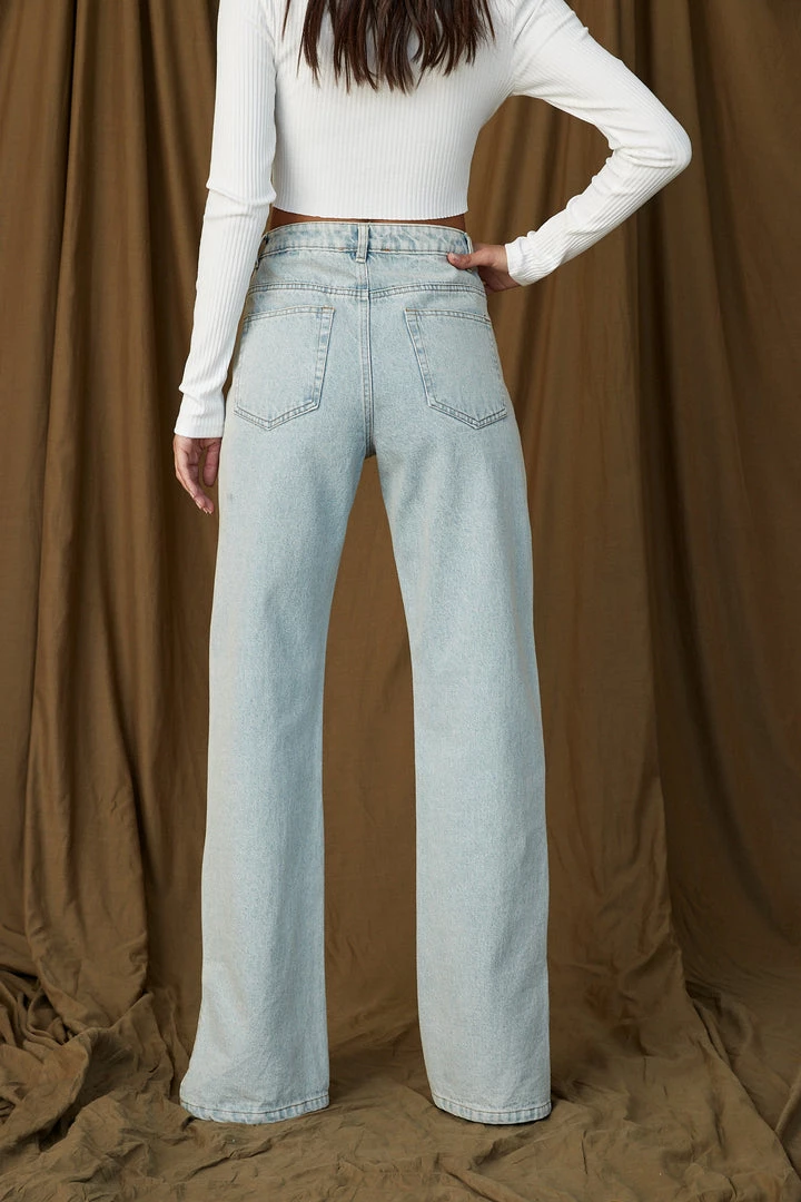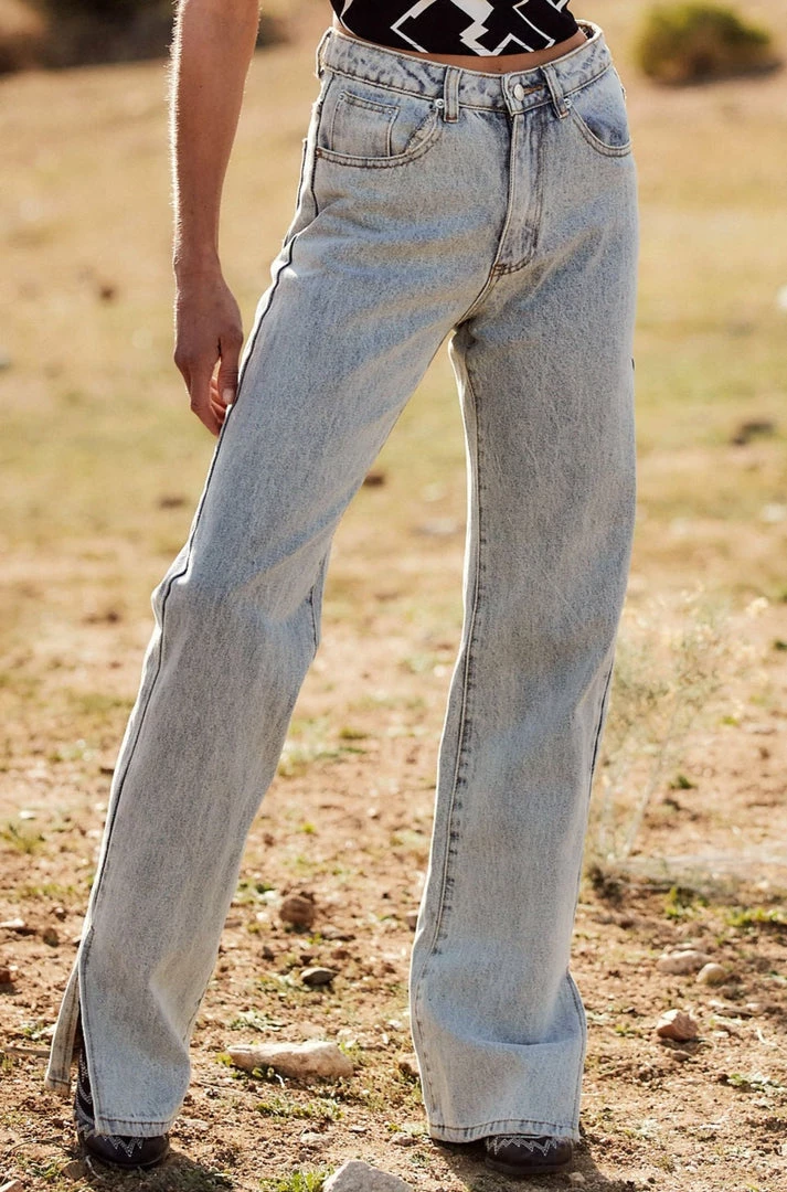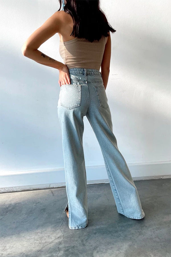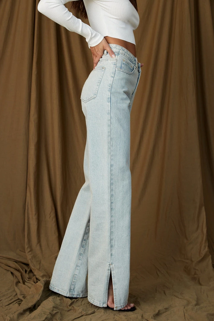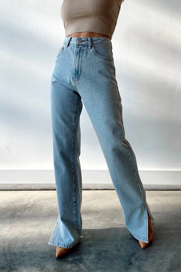 – Light wash jeans with a split hem