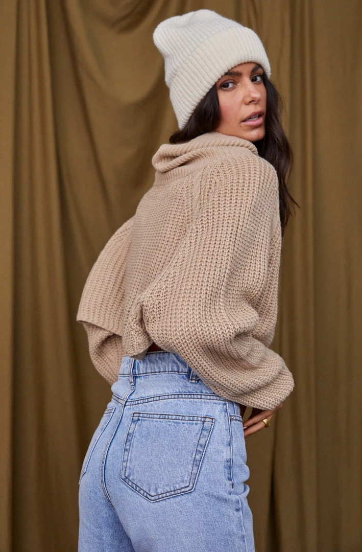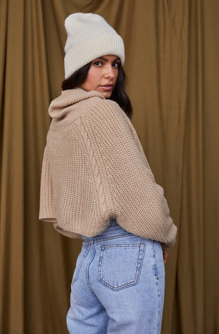 – Taupe turtleneck crop sweater with subtle knit designs.Â