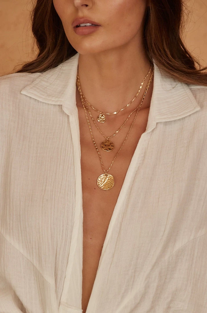 Join the layering party with the Asilah Triple Layered Necklace. Designed with three layers of gold pendants, you will be fully accessorized in no time! Pair with gold hoops and you’re ready to party.