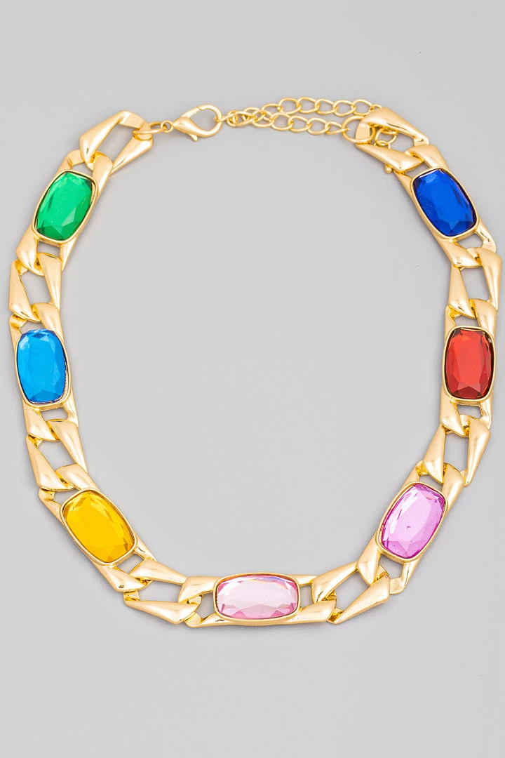 Up your accessory game with the Mystique Jeweled Oval Chain Necklace. Made with multicolored jewels, this unique piece adds the pop of color you were on the hunt for. This necklace adds all the fun to your outfit!