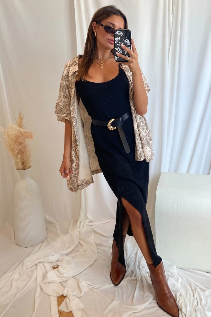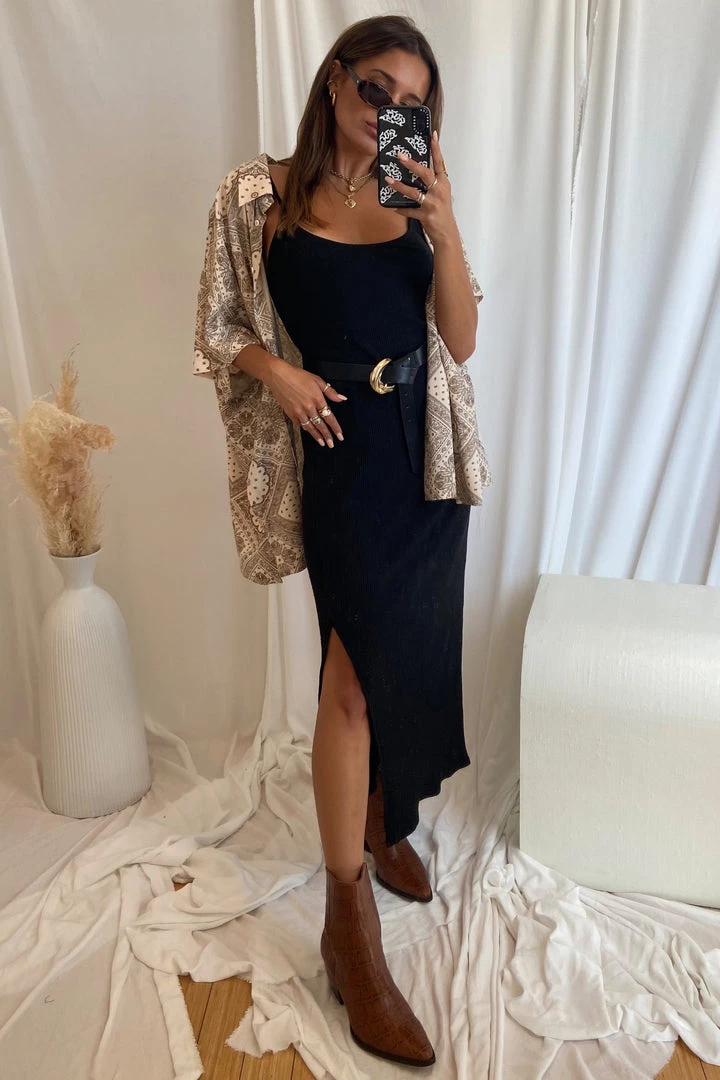 For your next backyard barbecue, grab for our Gemma Black Midi Dress. This dress is casual, comfy and great to wear to a summer party. We love wearing this dress with our Coconuts by Matisse Del Mar Natural Platform Slide.Â