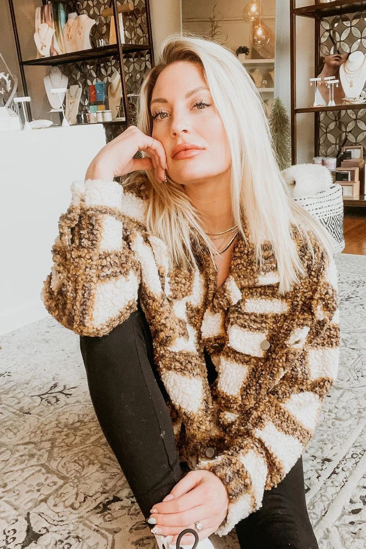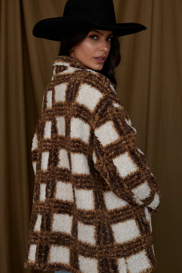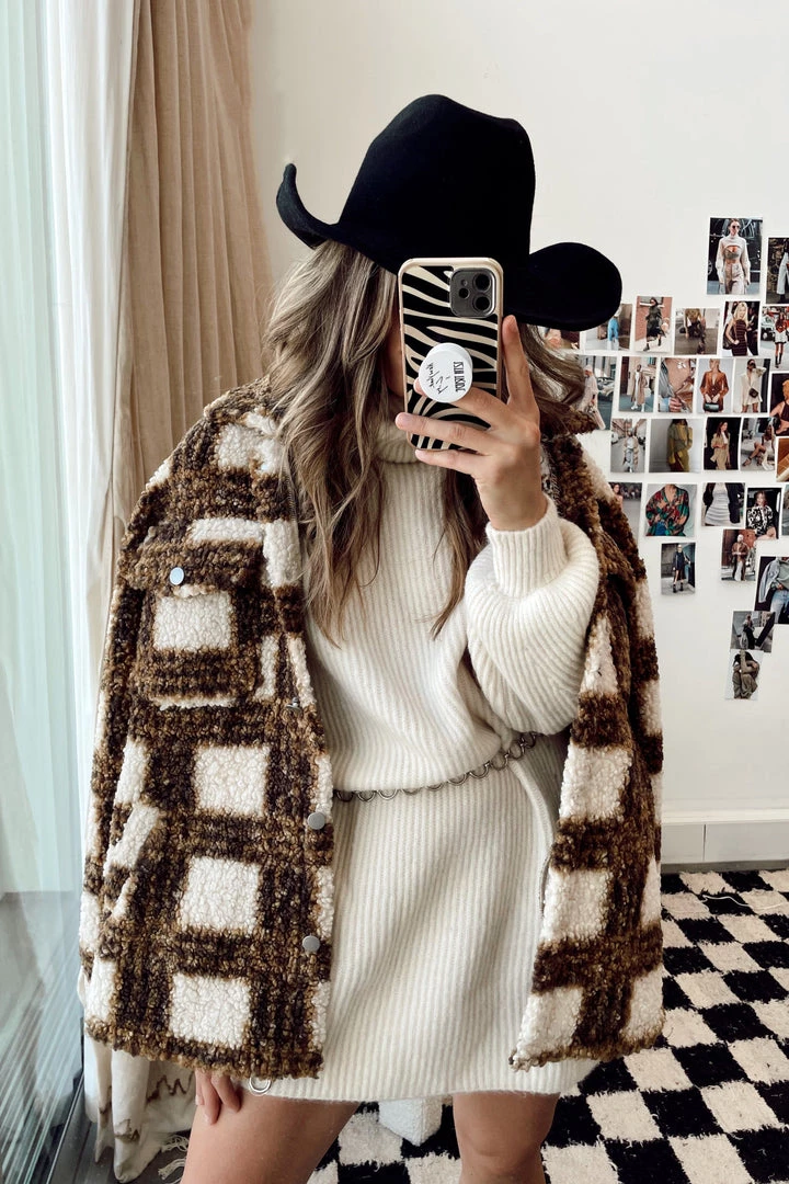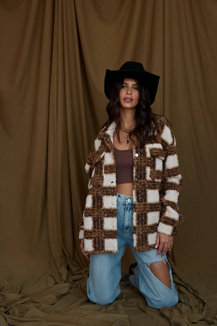 – camel and cream plaid sherpa shacket