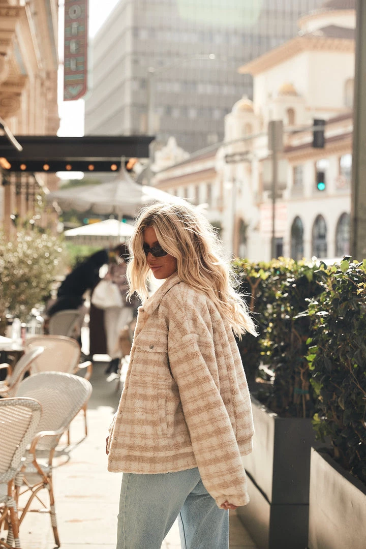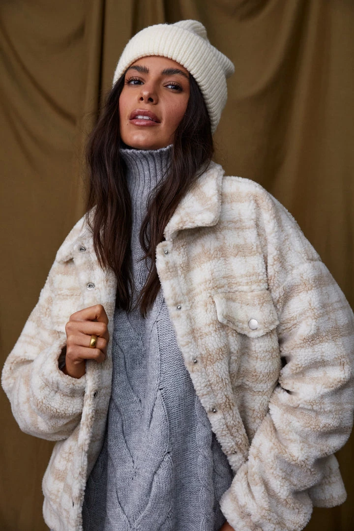 – beige and cream plaid teddy coat