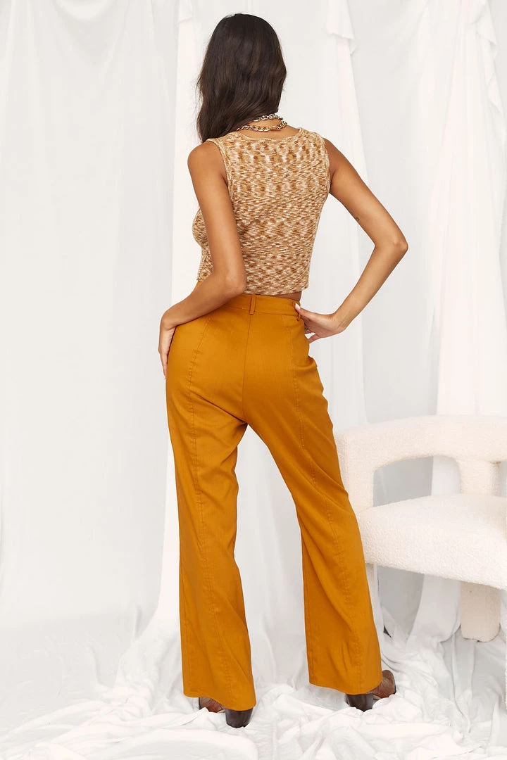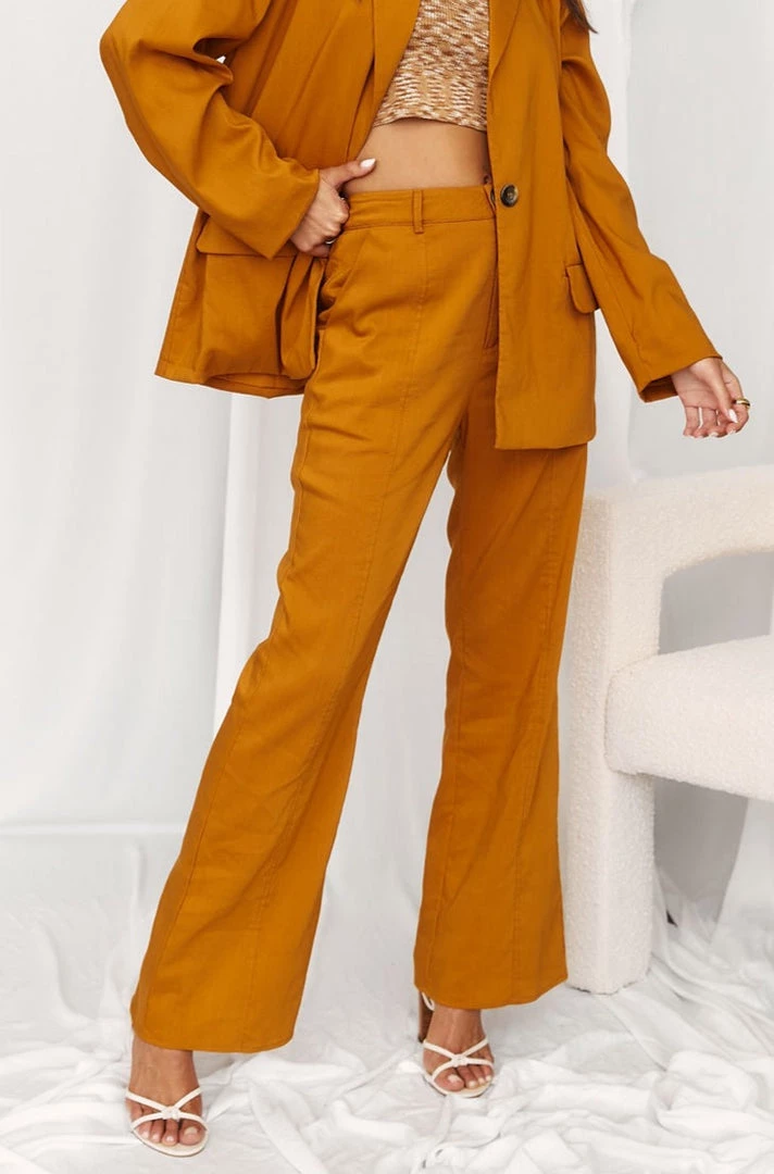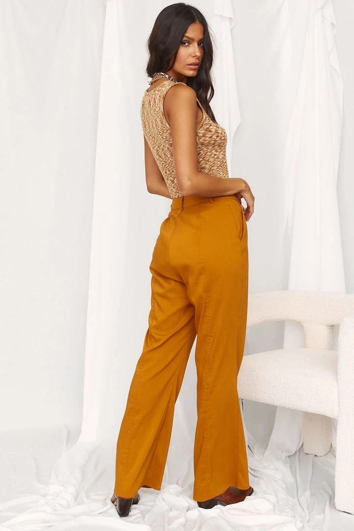 – pleated tangerine trousers