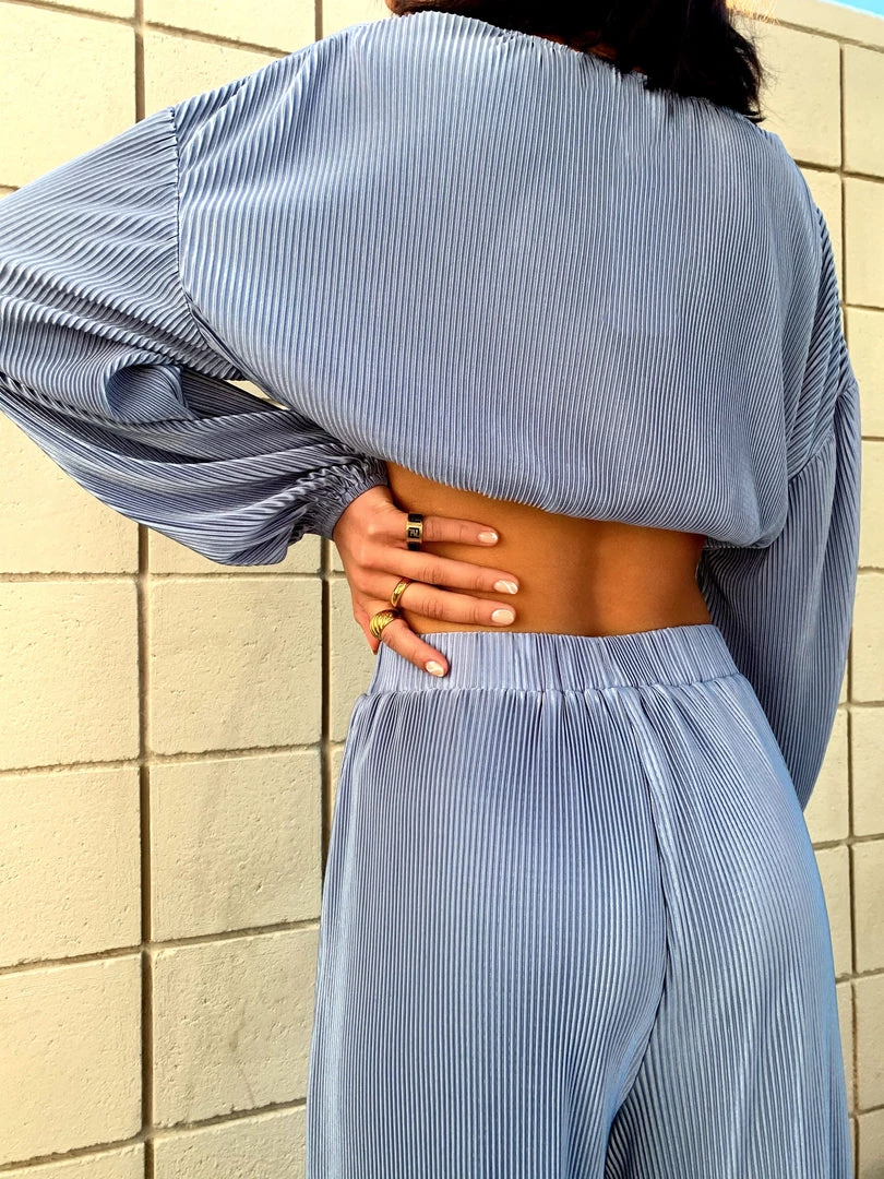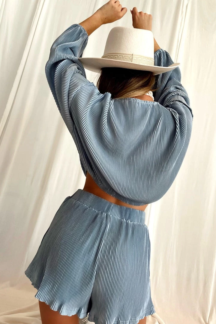 A set that can look so casual or so chic, the Maison! This pleated top is perfect for your day time coastal adventure or your beach front dinner styled with the Billini Younes Tan Lace Up Sandals. Pair with the matching Maison Dusty Blue Shorts and you are dressed for the entire day!