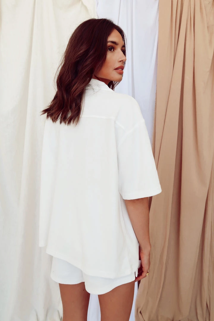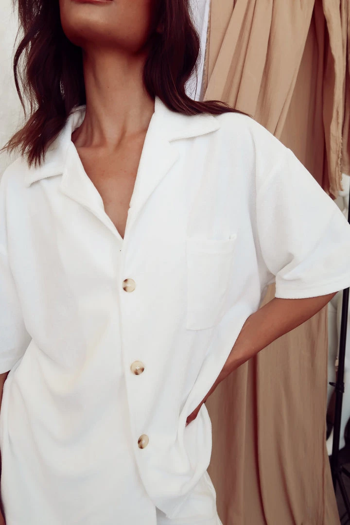 – Collared White terry button up top