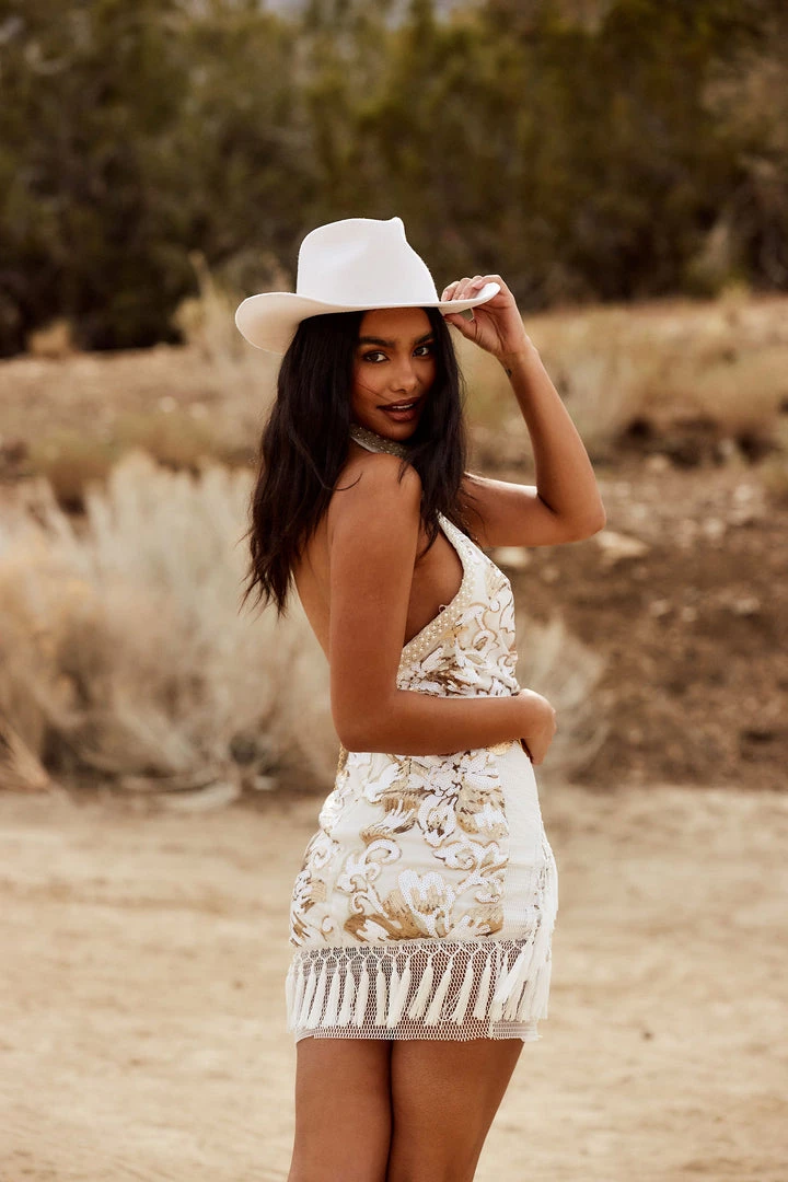 Go all out this festival season in the Like Gold Dust White Sequin Fringe Dress. The intricate pearl and sequin details on this piece will stand out amongst the crowd without a doubt. A great fit for any body type!