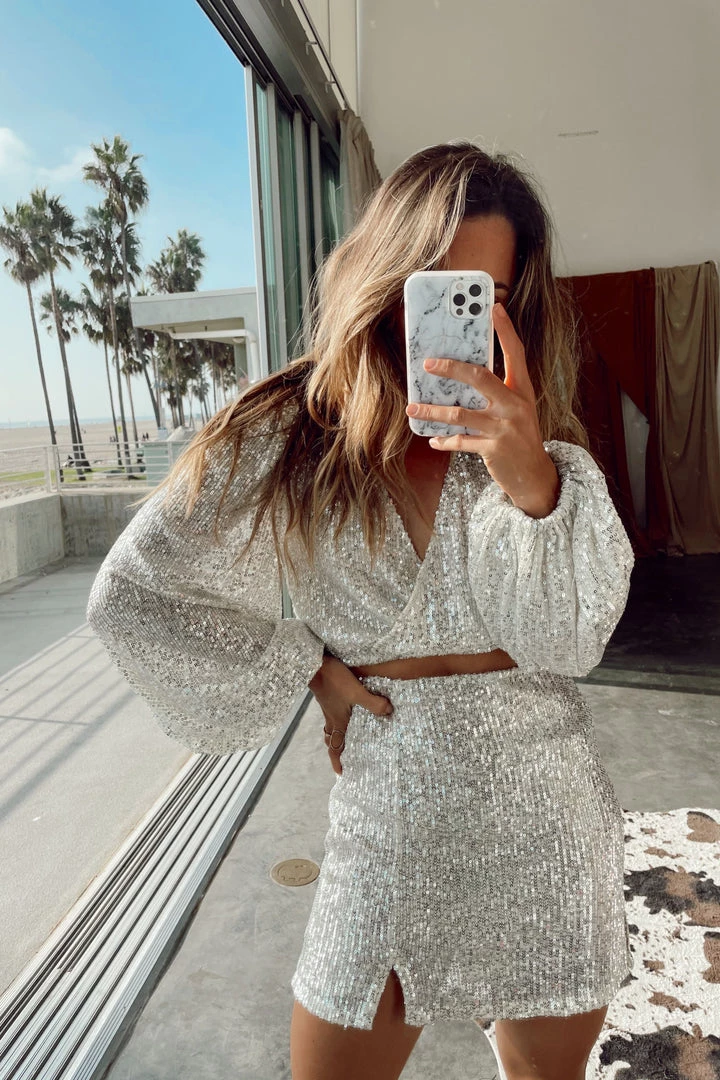 – Sequined mini skirt with two side slits